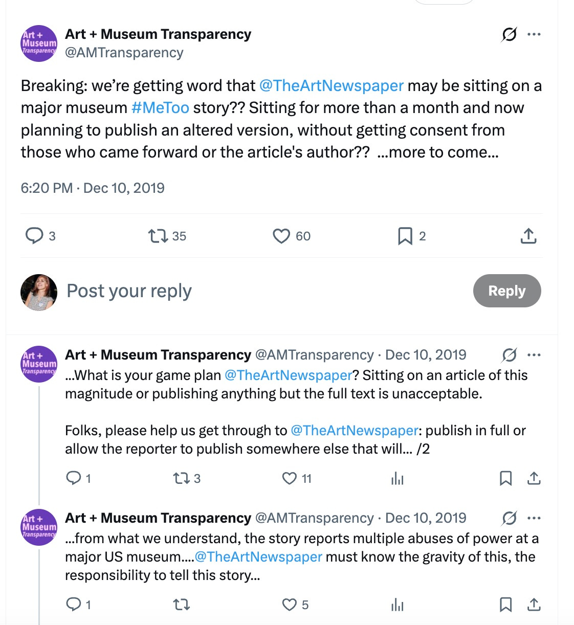 A short-lived Twitter account with the handle @artandmuseumtransparency repeatedly posted tweets such as, “We’re getting word that @TheArtNewspaper may be sitting on a major museum MeToo story?? Sitting for more than a month and now planning to publish an altered version, without getting consent from those who came forward or the article’s author??” Rizzo told one meeting attendee he had “emailed the reporter” and was hoping to hear back soon, and later made Instagram posts about PMA needing a union and disparaging Helmer specifically.
