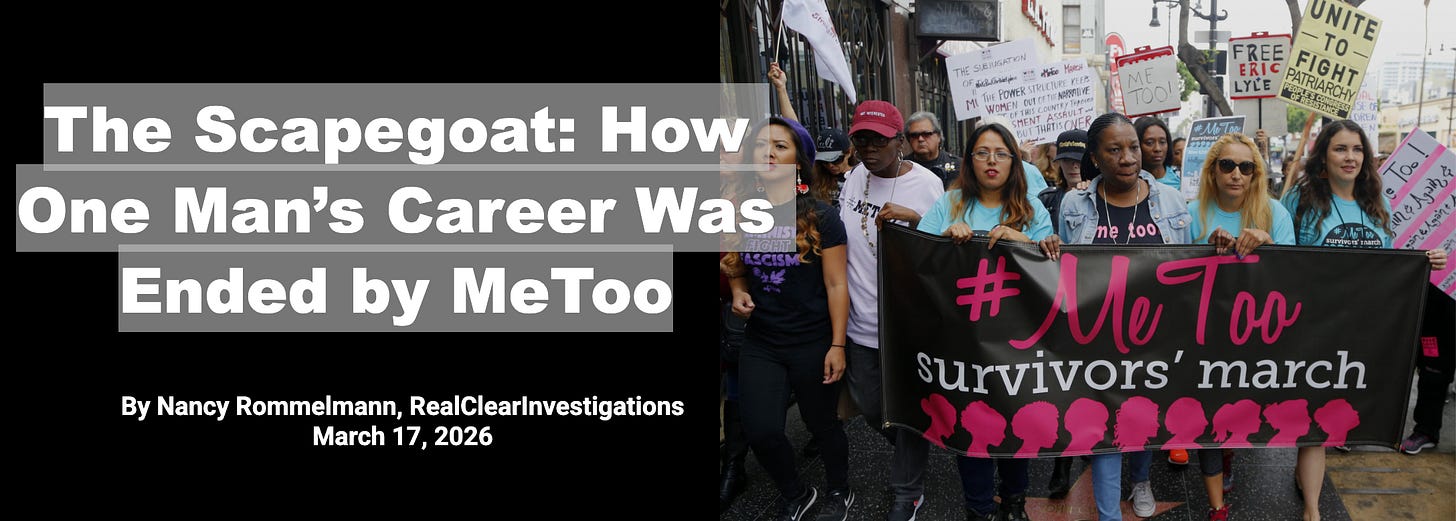 Hello readers - A long feature I wrote, “The Scapegoat: How One Man’s Career Was Ended by MeToo,” was just published on RealClearInvestigations, where I am contributor. You can read it over there, as RCI has no paywall. They also generously allow any other outlet (maybe yours?) to reprint their stories. Or you can read it here. This one was a bit of a doozy to write and will likely draw some controversy (been there). If you’re not already a paid or free subscriber, please consider becoming one. Let me know your thoughts in the comments xx