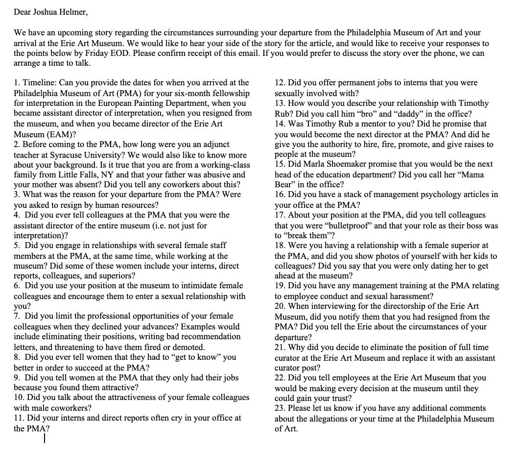 “We’ve been wondering, in the museum community, when this would land on this industry,” said Jeff Martin, host of the Museum Confidential episode featuring Pogrebin and Small. Small responded that they had “received an anonymous tip telling me to look into the Philadelphia Museum of Art.” The tip would have been around September 2019, more than a year and a half after Helmer left PMA. Nevertheless, on Nov. 13, Small sent Helmer a 700-word email, with the subject line, URGENT PRESS REQUEST, and giving Helmer 48-hours to respond to 23 detailed questions.